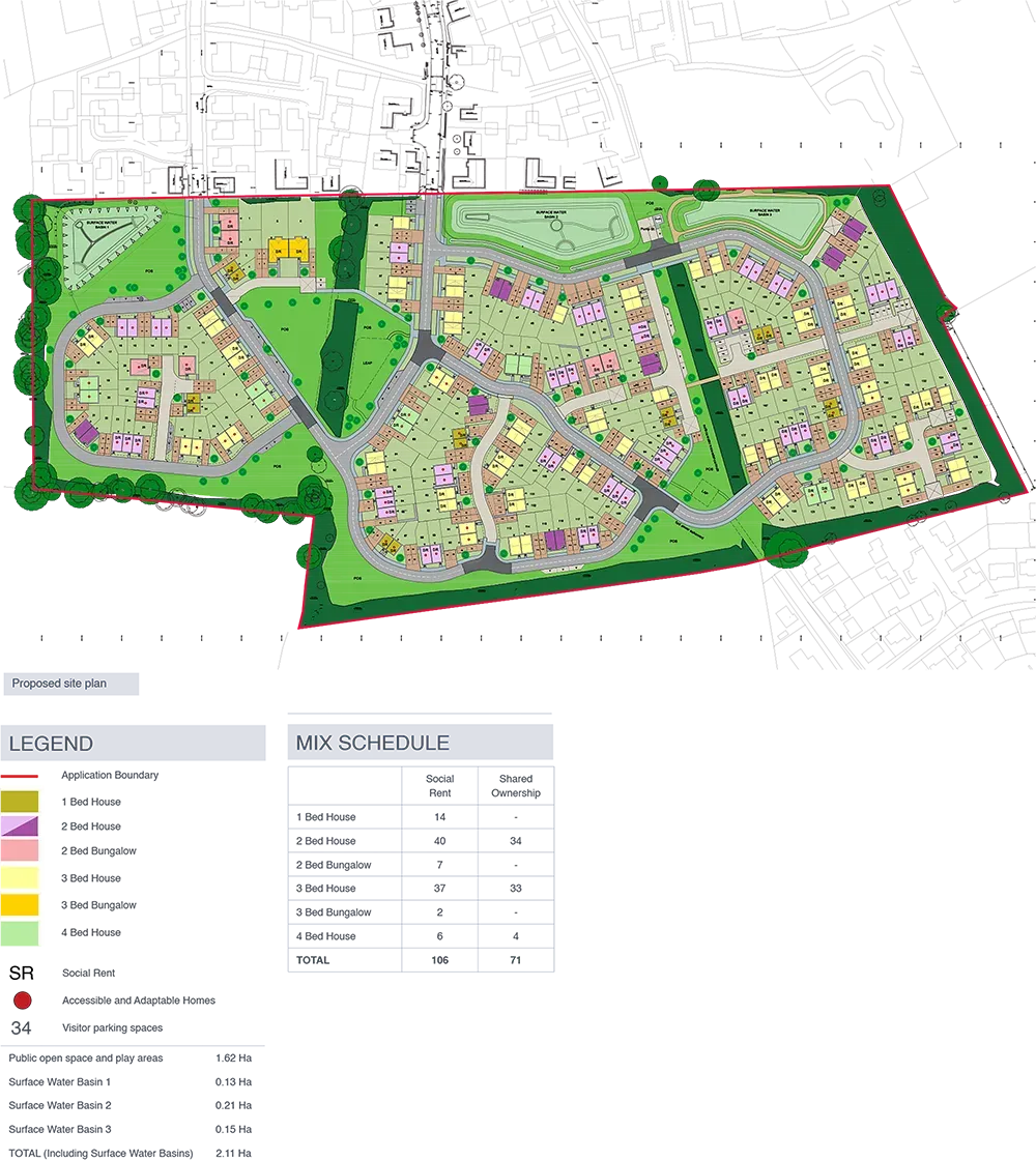 Our vision is to create a high quality, sustainable and sympathetic extension to the town that respects local character and that offers a range of attractive housing options. The proposal is for 100% affordable housing of which 106 (60%) of the homes would be provided for Social Rent and 71 (40%) as Shared Ownership properties.