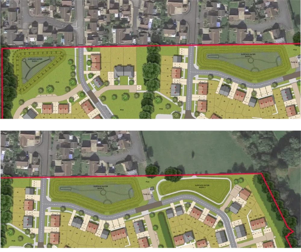 The proposal will capture surface water run-off on site, via a network of swales and filter margins which will treat and direct flows to a network of on-site attenuation basins which will hold water, prior to discharging it at a controlled and restricted lowest outfall rate, which will assist in reducing surface water runoff into the existing drainage ditch network in the local area in the extreme storm events by up to 75% compared to the existing situation.